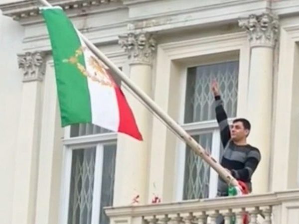 An anti-regime protester scaled the balcony of Iran’s Embassy in London on Friday and tore down the Islamic Republic’s flag, replacing it with Iran’s...